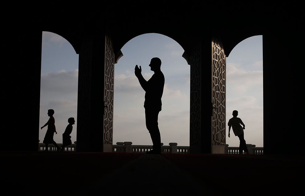 boyunca bir camide bir Filistinli adam ellerin semaya açmış dua ediyor. Ve çocuklar